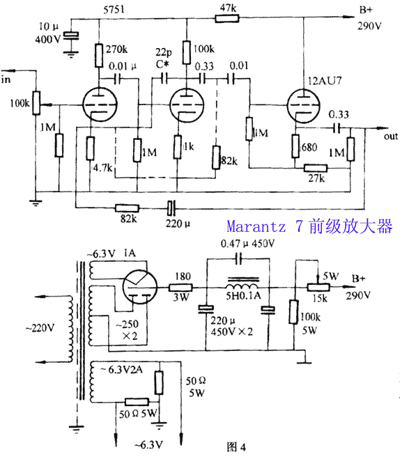 高频开环增益不够、负反馈对高频失真的改善也并不理想,但奇怪的是发烧界对Marantz7的音效印象还不错。这个制作中,V1、V2、V3笔者先是采用北京生产的出口管12AX7,但负反馈网络改接到第二级见图4之虚线部分,并取消防自激的C*22PF电容,这样可有效改善失真。12AX7属于高U管,放大倍数很大,但其内阻也较大,V3采用12AX7时似乎并非是最好的选择,我曾用美国的5751、12AU7代换过,此时高频有所改善,动态更大,音场的稳定性更好一些,用12AU7作阴极输出时,胆味相12AX7和5751少一些。12AU7可用6N10或ECC82代替,东芝的5963音效也有一定素质,它们的管脚是一样的,灯丝可采用6.3V或12.6V供电,在本机中采用交流6.3V供电。