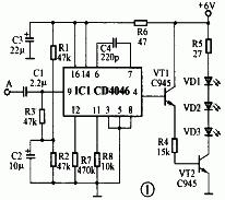 ,通过调频方式实现一款红外无线耳机.选用的锁相环器件CD4046是一种低频多功能锁相环集成电路,具有使用简单、VCO 中心频率和捕获频率范围可调、功耗低等特点.该