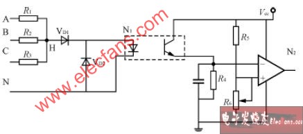 对于使用三相交流电的用电设备,一个最基本的可靠性保护功能就是三相输入缺相检测功能,当三相输入中任何一相电压缺相时,该电路模块输出缺相告警信号。通过对告警信号的处理,保证了对用电设备的安全保护。