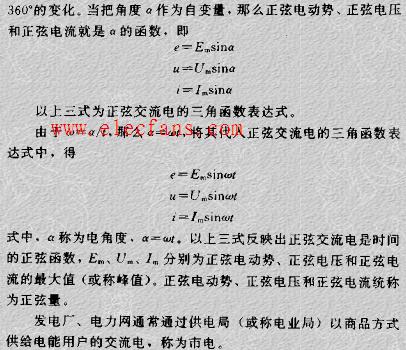 大小和方向均随时间作有规律变化的电压和电流称为交流电。所谓正弦交流电是指随着时间按正比函数规律周期性变化的交流电。正弦波形如图所示:交流电完成一次完整的变化所经历的时间,称为一个周期,在三角函数中相当于完成了