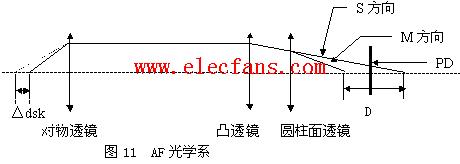 凸透镜焦点和圆柱面透镜的焦点之间的距离称为焦点间隔D,光盘上的检出范围是△dsk,检出范围越大,敏感度越低,但伺服越不易脱轨,反之检出范围越小,敏感度越高,但伺服易脱轨,D和△dsk是在设计焦点伺服误差检出系之前要确定的两个值,是设计的依据.