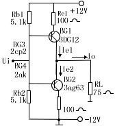 | 图3是串接式的跟随器,其特点是:(1)类似图2一样,R4两端交流电压具有自举作用;(2)BG2采用共基接法,使Ic2具有恒流作用,A、B两点交流阻抗RAB大大也提高,从而提高了跟随器的输入阻抗。 |