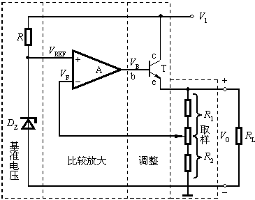 图1是串联反馈式稳压电路的一般结构图,图中VI是整流滤波电路的输出电压,T为调整管,A为比较放大电路,VREF为基准电压,它由稳压管DZ与限流电阻R串联所构成的简单稳压电路获得(可参见齐纳二极管一节),R1与R2组成反馈网络,是用来反映输出电压变化的取样环节。