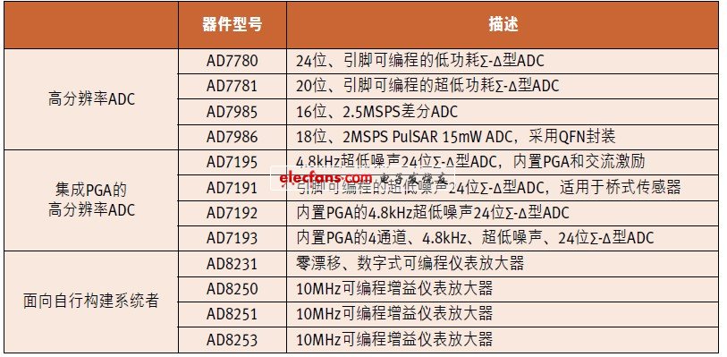 这也是利用数模转换器(DAC)补偿大多数信号的替代方案。在有些情况下,这仍然是一种可行的选择。目前适合增益范围调整方法的一款较流行PGA是AD8250。表1列出了一些ADC供参考。