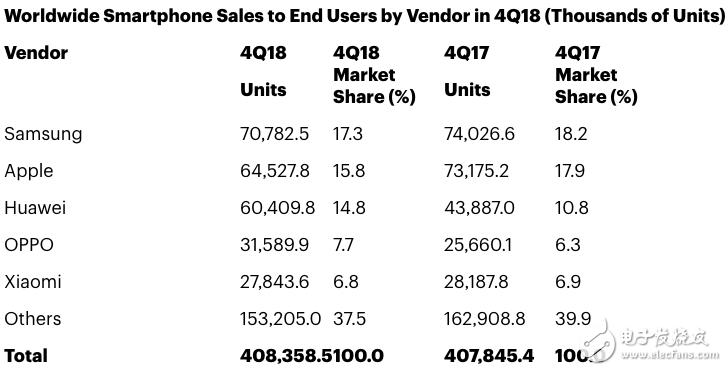 研究和顾问公司Gartner统计,2018年第四季度全球智能手机对终端用户的销量(以下简称智能手机销量)增势停滞,与2017年第四季度相比仅增加了0.1%,共计4.084