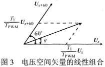 有了含6个有效矢量和2个零矢量的这8个基本电压空间矢量后,就可根据这些基本矢量合成尽可能多的电压矢量,以形成一个近似圆形的磁场。图3示出一种电压空间矢量的线性时间组合方法。输出的参考相电压矢量Uout的幅值代表相电压的幅值,其旋转角速度就是输出正弦电压的角频率。Uout可由相邻的两个基本电压矢量Ux和Ux±60的线性时间组合来合成,如:
