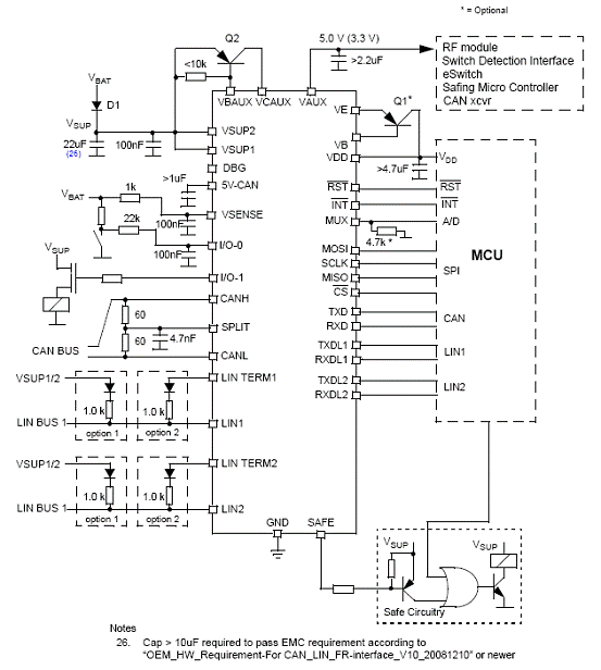 •Protected 5.0V or 3.3V regulators for MCU (part number selectable) and additional ICs (SPI configurable) with optional external PNP usage to increase current capability for MCU.