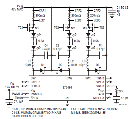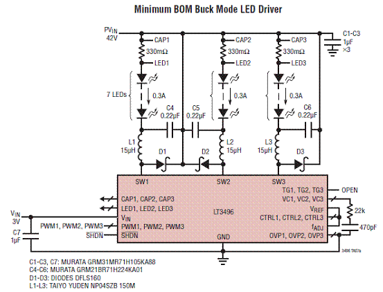 图9。LT3496三输出降压模式3x500mA LED串驱动器