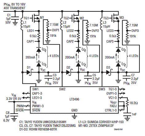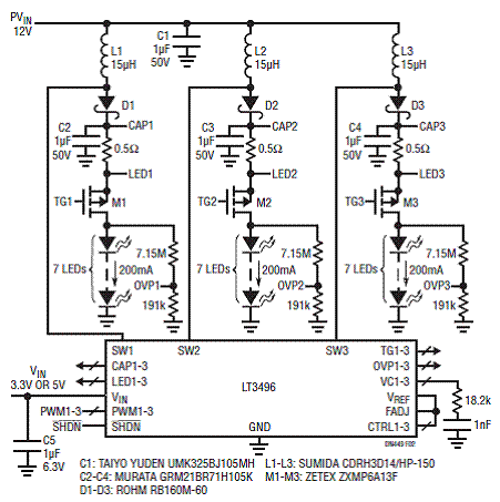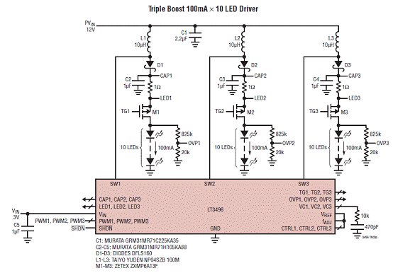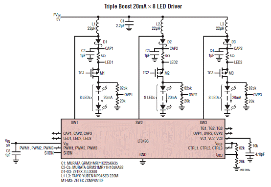图6。LT3496三输出升压20mAx8 LED驱动器