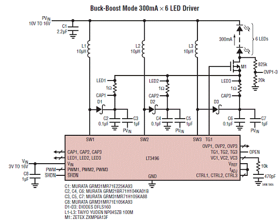 图7。LT3496降压-升压模式30mAx6 LED驱动器