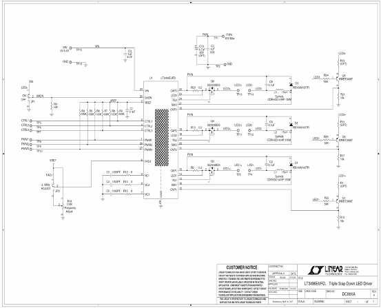 Demonstration circuit 986 is a Triple Step-Dow n LED Driver featuring the LT3496EU FD. The LT3496 is a triple output DC/DC converter designed to operate as current sources for driving high current LEDs. O n the demo board, the default current for each output channel is 500mA. Setting CTR L voltage to be less than 1V w ill control the current sense voltage to be one-tenth of CTR L voltage, therefore, reduce the LED current. The output current should not exceed the rated cur¬rent of the LEDs used. The LED current thermal de-rating should be considered to protect the LEDs. The maximum voltage of an LED string the demo board can drive is limited by the duty cycle and the input voltage of the LT3496. The demo board default switching frequency is 2.1M H z. At this frequency, the maximum duty cycle is 70% (M IN ). Lower the switching frequency results in higher maximum duty cycle. The maximum power input voltage (PVIN) is 45V. As a result, each channel of the demo board can drive up to ~31V total LED voltage. Adjustable switching frequency allows optimization of the efficiency and the external component size. At 2.1M H z, 93% efficiency can be achieved at 500mA with minimum solution size. Each of the three regulators on the demo board is in¬dependently operated. The PWM dimming feature of the LT3496 allow s True Color PWM dimming with the dimming ratio of 5000:1. Additional analog dimming is possible. The LT3476 datasheet gives complete description of the part, operation and application information. The datasheet must be read in conjunction with this quick start guide for working on or modifying the demo circuit 986.