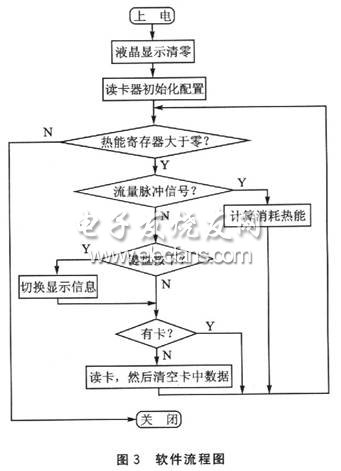 该热能表用于热水作为传热媒介的户用采暖系统,计量热水通过进水管道和回水管道所释放的热量;主要由流量计(水表)、数字式温度传感器、非接触式IC卡读卡模块(ZLG500)、液晶显示模块等组成。流量计用于计量流过采暖设备的热水的体积;两片温度传感器分别用于测量进水温度和回水温度;非接触式IC卡用于方便用户付费购暖和供暖部门管理,液晶用于显示一些基本信息。原理是根据流量计提供的流经管道的热水体积和配对温度传感器测量进水与回水的温度数据送至计算器,计算出消耗的热能,热能数据经处理后在LCD上显示出来。非接触式IC卡被识别后读出卡中的热能数值,然后把卡中的热能数据清零。随着使用的热能量增加.剩余的热能量相应减小。当剩余的热能量为零时,水表阀门自动关闭,停止供暖,等待用户购暖充值,重新开启供暖。