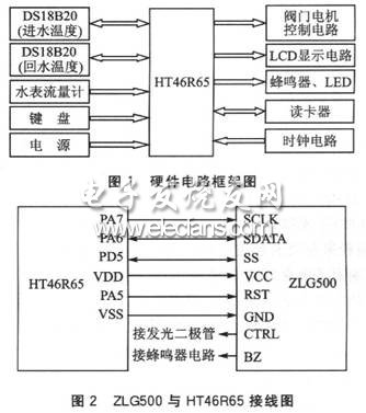 硬件部分主要由HT46R65、电源模块、时钟电路、温度传感器DSl8820、水表流量计、键盘和液晶LCD显示电路、读卡器、阀门电机控制电路等部分组成。外围组件与MCU的相互关系如图1所示,其中ZLG500与HT46R65的接线如图2所示。