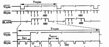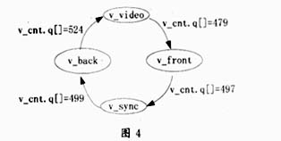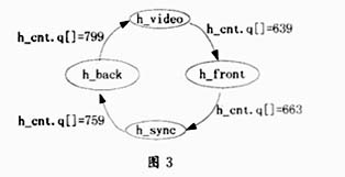 来确定状态。VGA的接口时序如图所示,场同步信号VSYNC在每帧(即送一次全屏的图像)开始的时候产生一个固定宽度的高脉冲,行同步信号HSYNC在每行开始的时候产生一个固定宽度的高脉冲,色彩数据在某些
