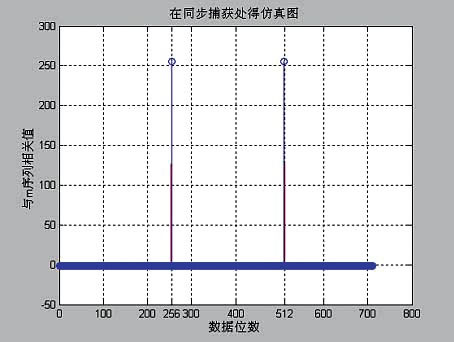 --- 5) 帧头同步捕获模块的设计:由于m序列具有很强的自相关性,利用255的m序列末尾加1个0作为同步头。当输入序列匹配与本地码相匹配时将出现相关峰值(输入序列存放在移位寄存器中),当不匹配时相关值很小。这里用2个上述码字,分别作为帧同步头和保密机同步头,其相关捕获过程的MATLAB仿真图如图3所示。这里在256和512处出现了相关峰值,即在这2点处本地码与寄存器中数据匹配相关。相关检测威廉希尔官方网站 在很多文献都有介绍,这里采取的也是通用的方法,只是在具体实现时,根据256bit来设计了一个移位寄存方法,采取2个4×64bit的移位寄存器作为输入序列的存放地点,分别用于帧同步头和保密机同步头捕获时输入序列与本地码元的自相关。由于在设计中需要捕获成功的使能信号提前一个时钟周期,因此本文的解决方法是将本地码沿着输入序列的反方向循环移动1bit,这样可以在序列进入255bit时得到相关峰,以提前1个时钟周期给出捕获成功的使能信号。