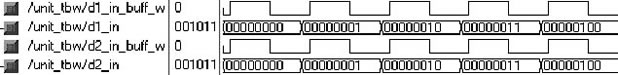 --- 通过在ISE软件中编写UCF文件,把程序下载到xc2vp20-fg676中测试通过,已经作为总体设计的一部分投入使用,并使用正常。在此,对整个设计用Modesim进行仿真一下,并给出结果:当话音输入为图5所示,从0000到0110,写入FIFO时钟如图v_in_buff_w为8kHz,则输出见图6所示,当时钟下降沿促发得empty为0后,下一时钟下降沿所抽取的数据为开始的有效值。