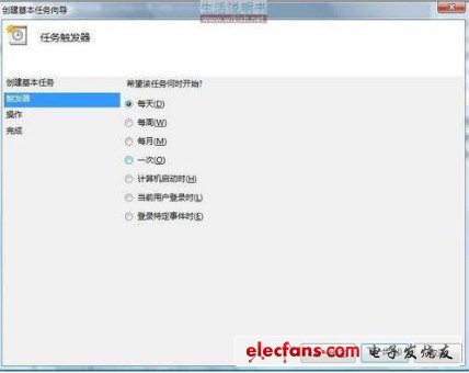 4. 来到“任务触发器”,根据需要选择什么时候运行,这里选择每天(以后随时可以调整)。完成后点击“下一步”。然后会让你选择具体运行的时间,根据需要自行选择。