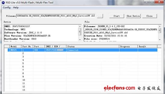 _P011_A010_HWp3_Service1FF.sbf,ROM的信息即刻会出现在File栏中。点击“MB525”,手机的信息会出现在Device栏中。