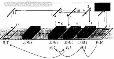 (4) 起重机将处理过的工件送入下一个指定的池中进行下步处理(见表1 中站1 : T3 )