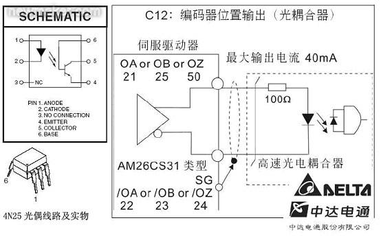 由于市场大多伺服系统驱动器为增量式编码器,断电不能记忆轴当前位置;本案通过4N25光偶连接PLC与伺服驱动器编码器输出口,通过PLC断电记忆区来记忆断电前位置值。其连接方式 如图6。
