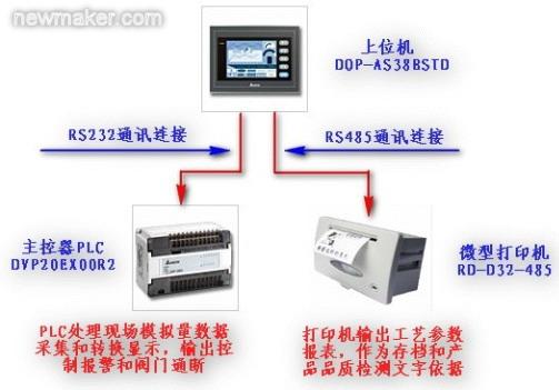 (2)系统通讯原理设计:COM1:RS232通讯方式与下位PLC连接,进行蒸馏水设备和产品各项工艺参数设置和读取。COM2:RS485通讯方式与微型打印机连接,利用台达HMI宏指令编程功能,处理自由口通讯协议,发送给打印机需要打印的汉字、英文字母以及数字等,可以进行产品工艺参数报表打印,作为产品品质检测的文字依据以及存档保存数据。