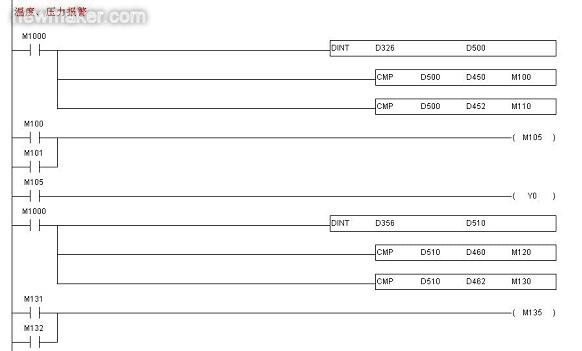 PLC用户控制程序主要实现模拟量数据采集和运算转换,超限报警输出控制。一定要根据传感器和变送器模拟信号量程范围计算数字量显示值,根据用户提供的工艺要求编写报警处理程序。图2是PLC控制程序节选,仅供参考。