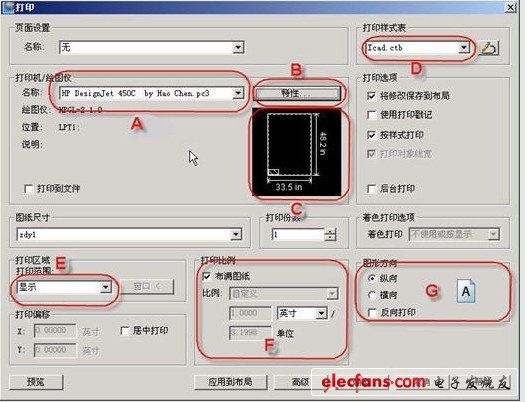G:图形方向设置:设置图形在纸面上的排列方向,可通过微缩预览框来看设置是否合理。在有些打印设备中可以选择横向或纵向的纸张尺寸,图框也可能是横向或纵向的,打印时只要保证两者匹配即可。