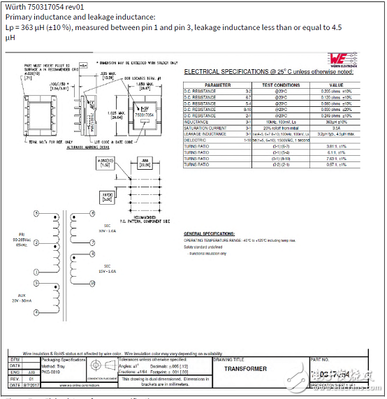 图8.IRXPSU1 36 W反激评估板反激变压器指标