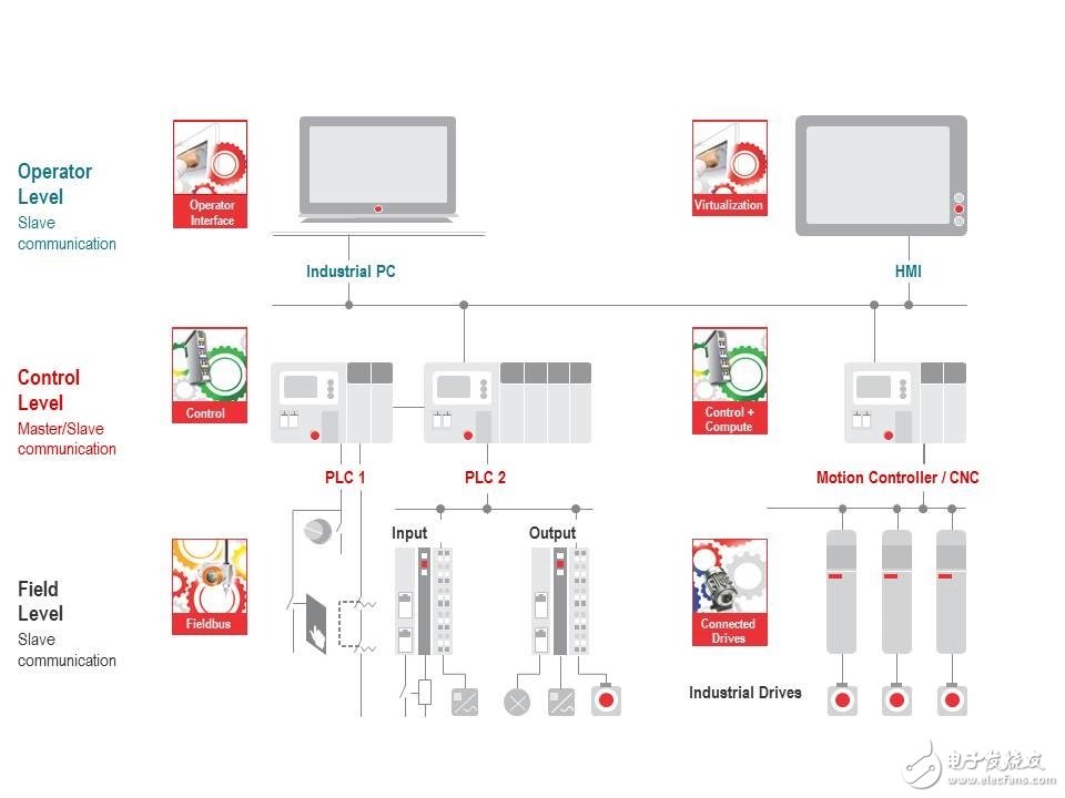 针对工业4.0的工厂自动化系统通常主要包括三个层级的设备,用于驱动实时通信和控制: