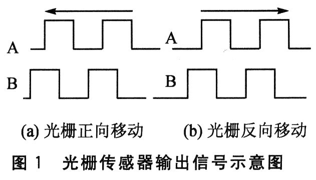 在实际应用中,光栅传感器输出两路相位相差为90°的方波信号A和B。如图1所示,用A、B两相信号的脉冲数表示光栅走过的位移量,标志光栅分正向与反向移动。四倍频后的信号经计数器计数后转化为相对位置。实现计数过程一般有两种方法:一是由微处理器内部定时计数器实现;二是由可逆计数器实现对正反向脉冲的计数。