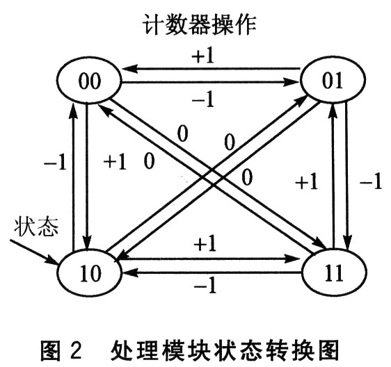 综合上述分析,可以做出处理模块状态转换图,如图2所示。其中“+”、“-”分别表示计数器加/减1,“0”表示计数器不动作。
