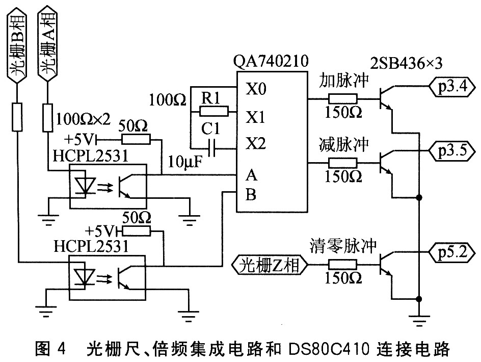 光栅信号检测电路可以由光敏三极管、比较器LM339、2片74193串联组成。但是这种设计方案往往需要增加较多的可编程计数器,电路元器件众多、结构复杂、功耗增加、稳定性下降。因此,本文对经过SGC-4.2型光栅尺(50线/mm)出来的脉冲信号进行倍频处理时,选择4倍频专用集成电路芯片QA740210来实现,对信号4细分后,可得分辨率为5μm的计数脉冲,这在工业测控中已达到了很高的精确度。QA740210集成电路可将两路正交的方波进行四倍频,并能根据输入信号的相位关系进行相位判别,产生2路加、减计数信号,可直接送到DS80C410高速计数器进行计数。