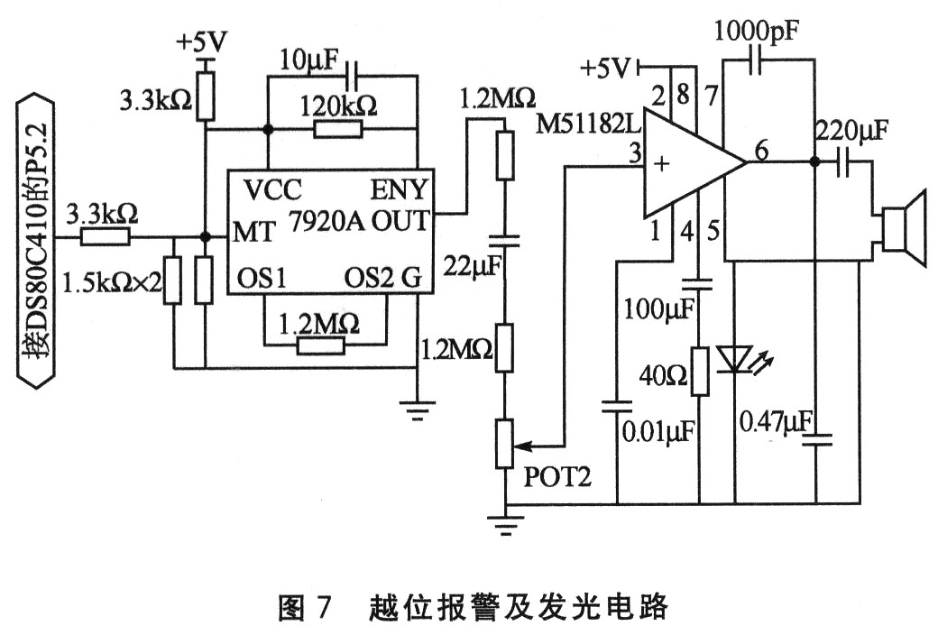 为限制位移执行机构在规定的范围内运动,必须用软件设置限位开关,每一边界有一限位开关。当撞到限位开关时,通过DS80C410从输出端口P5.2输出一个“1”电平,经电阻分压后,7920A的控制端MT得到约+1.5 V的电压,于是从其乐曲信号输出端OUT输出华尔兹乐曲信号,经过放大电路M51182L放大后,驱动扬声器发出相应的报警乐曲声,音量的大小可以通过调整10 kΩ电位器来实现。同时接通发光二极管,红灯报警,同时控制电机停止运转。具体电路如图7所示。