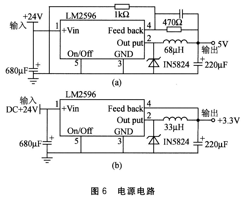 在进行整个控制系统设计时,如果电源系统过于复杂和冗余,不仅会对其他部分电路产生电磁干扰,而且经济效益也不好,所以设计中所有芯片都选择的是5 V、3.3 V或者1.8 V供电电压。这样,电源设计时只要用3片LM2596和一些电容、电感、二极管等就可以将24 V电压直接转化为所需电压,电路设计不仅容易,也非常经济,电源电路如图6所示。具体使用时可以根据需要选择LM2596-5V、LM2596-3.3V、LM2596-1.8V的芯片。要获得+1.8 V和+5 V时用图6(a)的接法,要获得+3.3 V时,用图6(b)的接法。