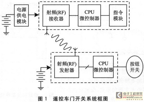 图l为RKE系统的简单框图。由框图可以看出,用户按下钥匙扣上的按钮开关即可触发系统工作,唤醒RKE钥匙扣内部的CPU,CPU则发送数据流到射频(RF)发射机。数据流通常是64~128位长,包括1个前置位、1个命令码和1个滚动码,采用2~20 kHz的发送速率。在车内的RKE射频接收机捕捉射频信号并解调,传送数据流给cPu,由cPu对数据进行译码并发送指令到指令模块。调制方式为幅度键控(AsK),主要目的是延长钥匙扣的电池寿命。