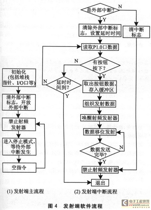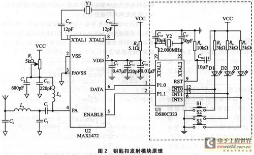 DS80C323的功能是利用其外部中断对按钮进行扫描,并将扫描的结果加密编码,通过P1.O送给发射器的数据端DATA。DS80C323的P1.1控制发射器的唤醒。
