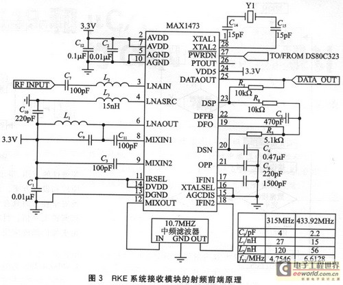 对于射频接收器,使用与发射器MAXl472配对的MAXl473。MAXl473是一款完全集成的、低功耗、CMOS超外差ASK接收器,工作在300~450 MHz频段,具有一114 dBm的高灵敏度、高于50 dB的镜像载波抑制。这款芯片在关断模式下电流消耗低于1.5μA,在接收模式电流消耗为5.2 mA。MAXl473可接收最高达100 kbps的数据速率,从关断模式到有效数据输出的过渡时间小于250 μs。MAXl473包含一个一级自动增益控制(AGC)电路,在射频输入信号电平大于一57dBrm时,可降低低噪声放大器(LNA)35dB的增益。接收器使用带有接收信号强度指示(RSSD的10.7 MHz中频滤波器,带有集成压控振荡器VCD的片上锁相环(PLL)以及基带数据恢复电路。MAXl473仅需很少的外围元件即可构成RKE系统接收模块的射频前端,如图3所示。