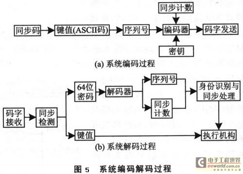 解码过程如图6(b)所示。解码电路接收到数据包后,将键值与密文分开,并将密文用密匙解密后还原为序列号和同步计数值,并在核对序列号及同步计数值后依照键值驱动相应的执行机构。