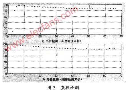 图3是对边缘二值图像进行直径检测的结果,检测的点间隔为10个像素,型坯长度约为630个像素。其中,图3(a)是对灰度阈值分割法得到的边缘轮廓进行处理的结果,图3(b)是对Canny算子检测到的边缘轮廓进行处理的结果。两种算法得到的直径分布基本一致。