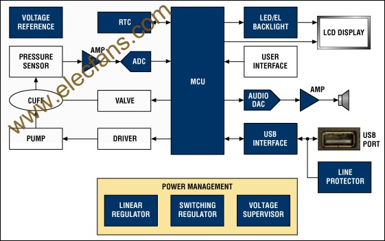自动检测血压计有两种类型:上臂式血压计和腕式血压计。有些血压计能够把数据上传到计算机,以便进行更深入的分析和后期测量跟踪,可以通过USB接口传输数据。可以选择一个分立的USB收发器,也可以选择内置这种收发器微控制器。本文主要介绍电子血压计的设计要点。