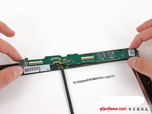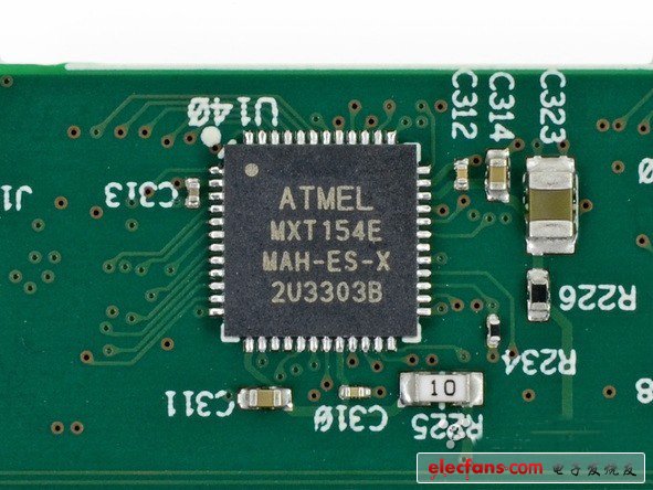 看完主板之后,我们再来看看 Surface 内部的另外一块小型电路板。这块电路板的正面带有三个 Atmel MXT154E 触屏控制器,也就是说电路板只作用于 Surface 的 10.6 英寸屏幕。