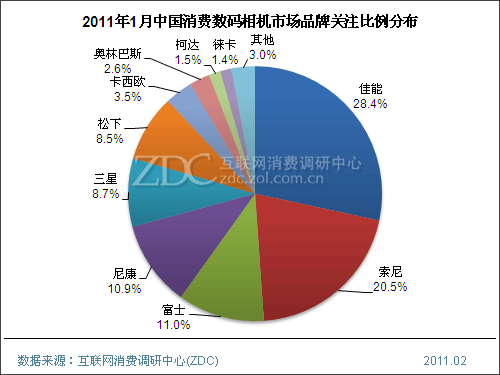 2011年1月,众多数码相机厂商集中在CES前后发布了近百款春季新品,主要集中在消费数码相机市场。在中国数码相机市场中,由于春节促销期的临近以及库存的不稳定,多款热门产品的售价出现了明显的波动。互联网消费调研中心ZDC总结1月中国数码相机市场品牌、产品关注数据进行分析: