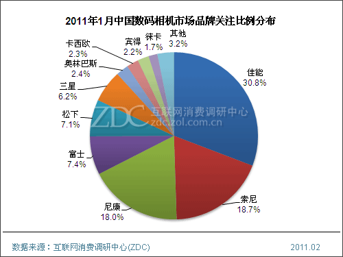 受到各品牌新品集中发布的影响,2011年1月中国数码相机市场的品牌关注集中程度较上月明显下降。佳能仍领跑中国数码相机市场,但其关注比例较上月下降了3.5%,索尼、尼康、富士、松下等品牌的关注比例则有不同程度的上升。