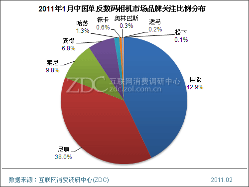 (图)2011年1月中国单反数码相机市场品牌关注比例分布