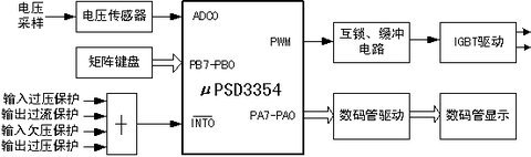 方式,存在一定的误差,而且电路比较复杂[2]。本文设计了一种以ST 公司的高性能单片机μpsd3354 为控制核心的输出电压大范围连续可调的功率开关电源,由单片机直接产生PWM 波,对开关电源的主电路