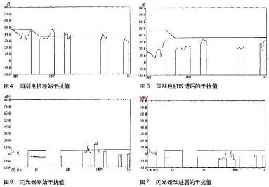 雨刮电机是设备中典型的感性负载干扰源,功率较大,采用零部件测试方式对其测量,先对电机的换向器结构做了调整,并在电机内部对电路做了滤波处理。图4、图5是改进前后的结果,射频段干扰也有明显改进。