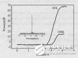 宽 35μm 的条形激光器在 5k Hz 、1 %占空比的脉冲电流驱动下最高工作温度为 120 K ,81 K 未经修正的