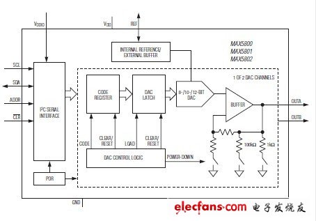 The MAX5800/MAX5801/MAX5802 2-channel, low-power,8-/10-/12-bit, voltage-output digital-to-analog converters(DACs) include output buffers and an internal referencethat is selectable to be 2.048V, 2.500V, or 4.096V. TheMAX5800/MAX5801/MAX5802 accept a wide supplyvoltage range of 2.7V to 5.5V with extremely low power(1.5mW) consumption to accommodate most low-voltageapplications. A precision external reference input allowsrail-to-rail operation and presents a 100kI (typ) load toan external reference.