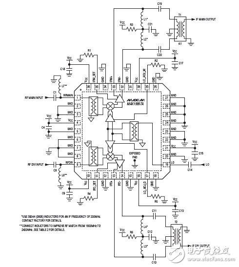 该器件在RF和LO端口集成有非平衡变压器,此外器件还包含一个LO缓冲器、两个双平衡混频器和一对差分IF输出放大器。MAX19997A需要一个典型值为0dBm的LO驱动,电源电流保证低于420mA,以达到预期的线性度指标。