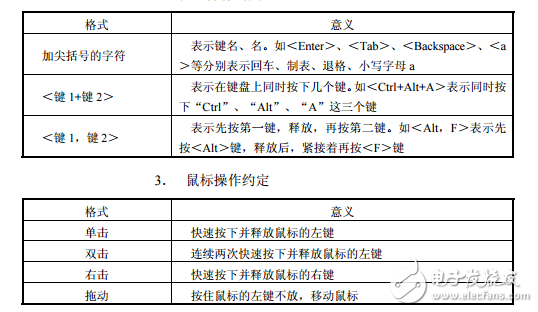 介绍符号的约定、键盘操作约定、鼠标操作约定以及四类标志。 1. 符号约定带尖括号“< >”表示键名、名以及操作员从终端输入的信息;带方括号 “[ ]”表示人机界面、菜单条、数据表和字段名等,多级菜单用“→” 隔开。如[文件→新建→文件夹]多级菜单表示[文件]菜单下的[新建]子菜单下的[文件夹]菜单项。 2. 键盘操作约定